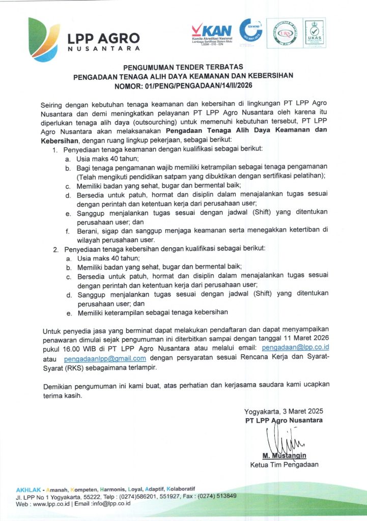 Untuk penyedia jasa yang berminat dapat melakukan pendaftaran dan dapat menyampaikan penawaran dimulai sejak pengumuman ini diterbitkan sampai dengan tanggal 11 Maret 2026 pukul 16.00 WIB di PT LPP Agro Nusantara atau melalui email: pengadaan@lpp.co.id atau pengadaanlpp@gmail.com dengan persyaratan sesuai Rencana Kerja dan Syarat-Syarat (RKS) sebagaimana terlampir.